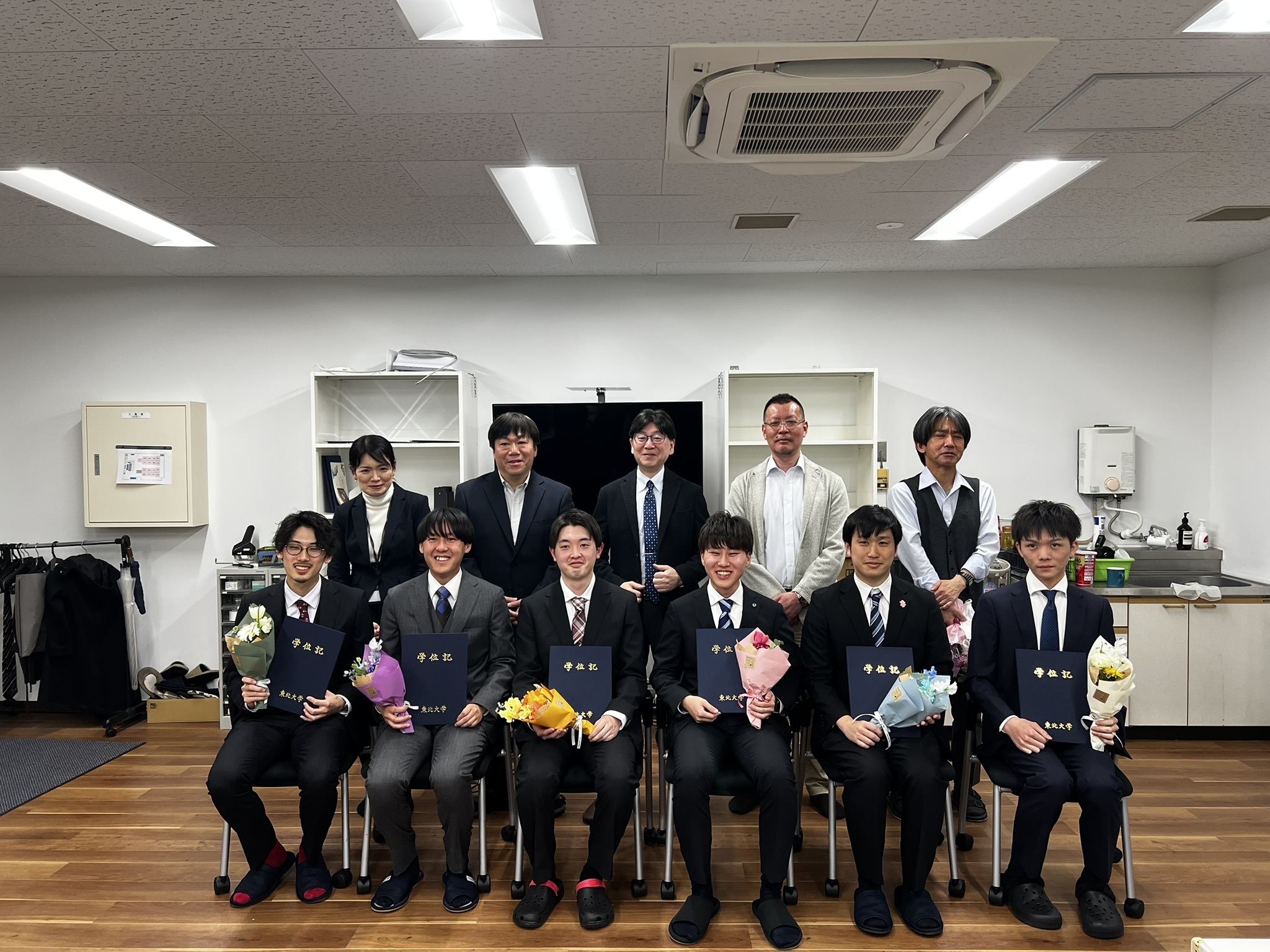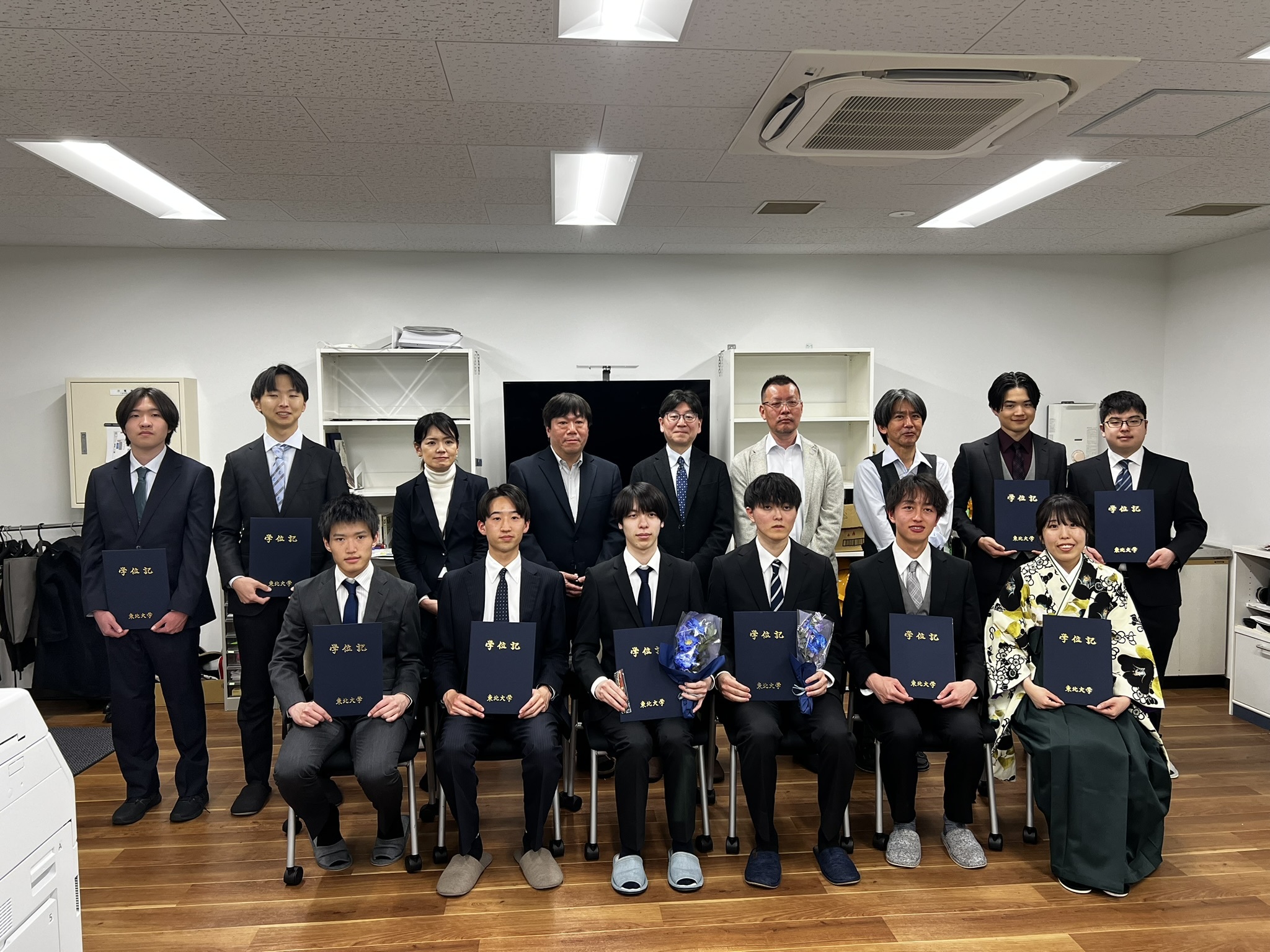 研究室にて学位記授与式が行われ、和泉さん、國見さん、早坂さん、山根さん、吉田さん、内村さんが修了、大串さん、大谷さん、岡崎さん、濱谷さん、三菅さん、吉川さん、景山さん、兜森さん、本間さん、竹アさん、前田さんが卒業しました。